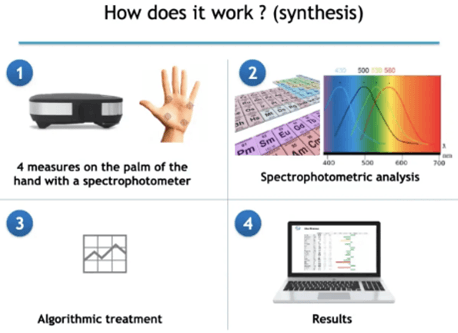 OligoScan is a painless, non-invasive scan of the hand that is completed in just a few moments. The scan is based on the concept that each chemical compound emits, absorbs, or reflects a specific wavelength of light. The OligoScan device transmits light through tissues at four points on your hand. It measures the optical density of heavy metals, minerals, and trace elements present in skin and blood vessels in real time.